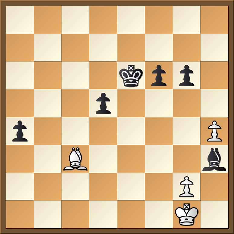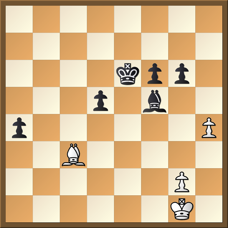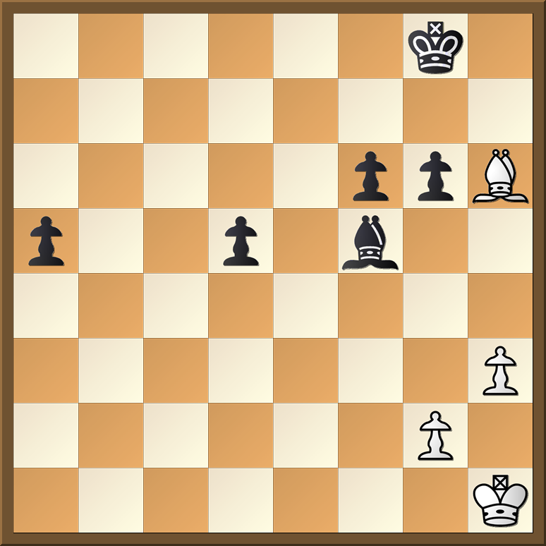 39…Bg2 40.h4 Bf3 41.b4 Bh1 42.Be2 Bg2 43.Bg4 Be4 44.Bc8 Kc7 45.Be6 Kd6 46.Bg8 h6 47.Bf7 h5 All blacks pawns are now on light squares.