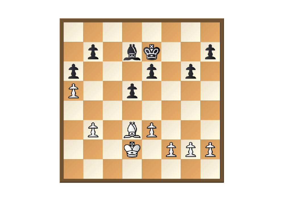 The bishop now controls the two passed pawns. White is planning to play the K to e3 and B to d4 to complete the fortress with the dark squares all under control. All seems well for white.